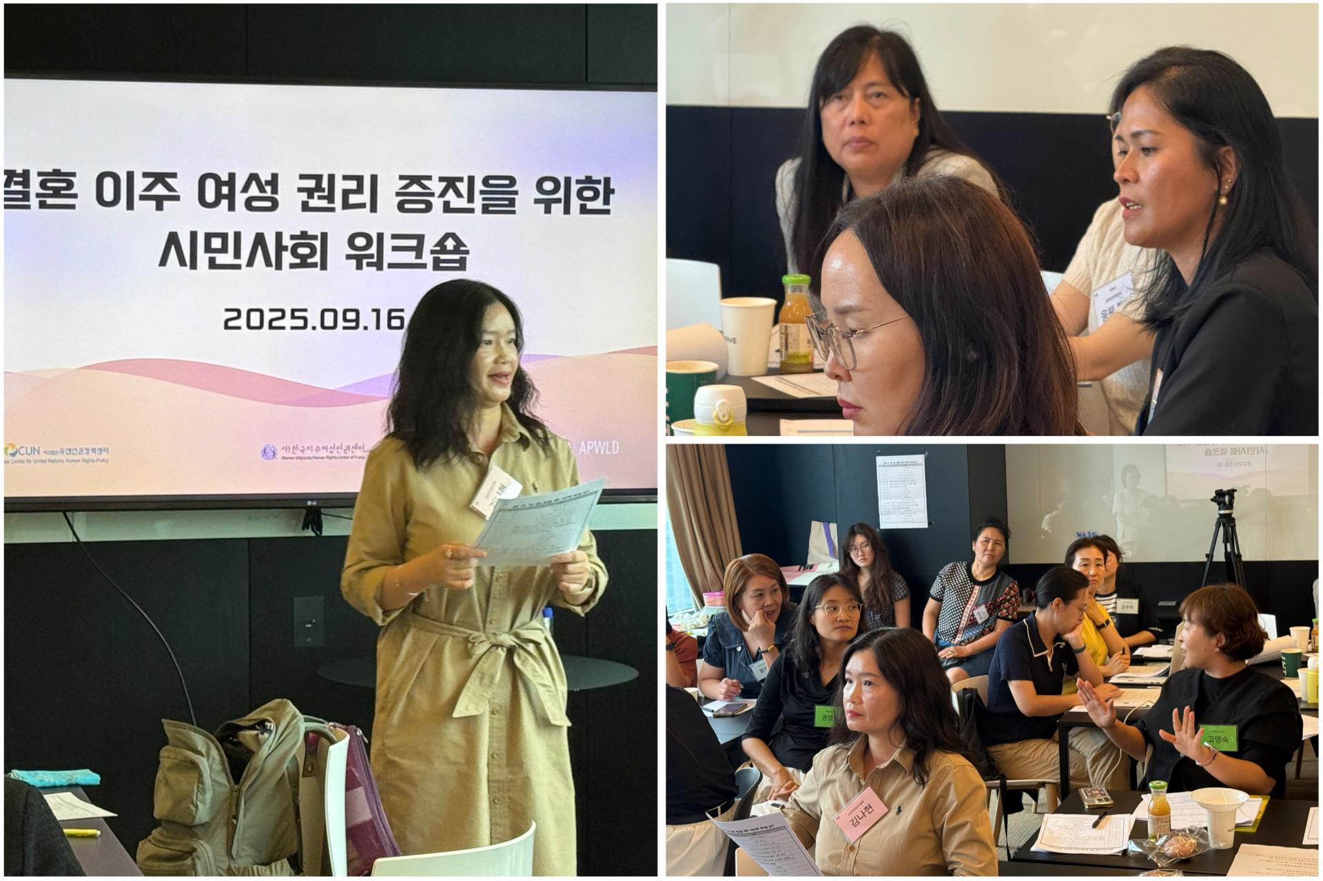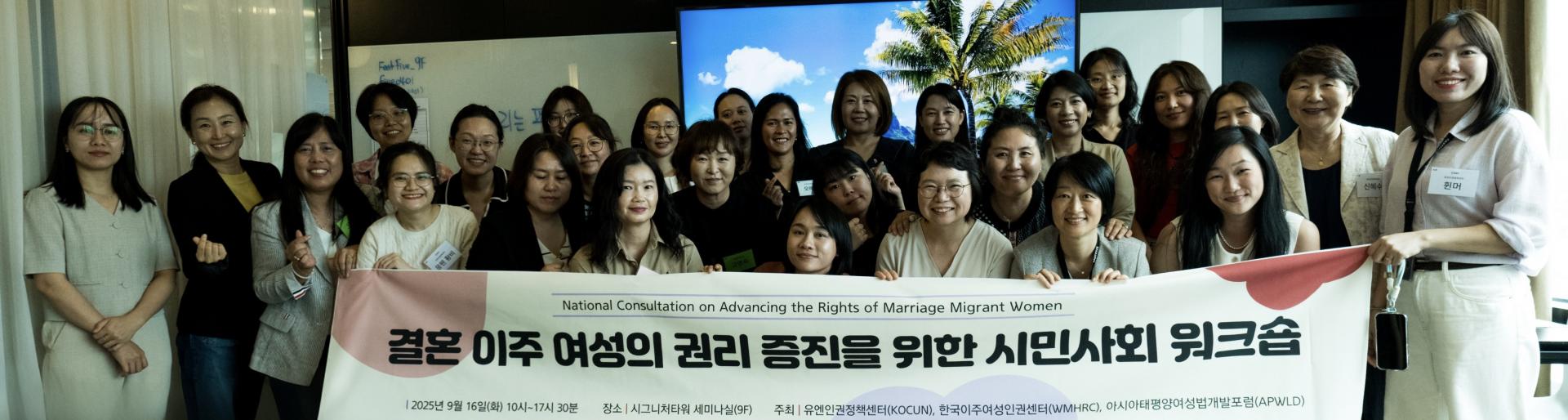 지난 9월 16일, 서울 중구 시그니처타워 세미나실에서 「결혼이주여성 권리 증진을 위한 시민사회 워크숍」이 열렸습니다. 이번 워크숍은 유엔인권정책센터(KOCUN)와 한국이주여성인권센터(WMHRC)가 공동으로 주최했고, 아시아태평양 여성인권 네트워크인 APWLD가 지원했습니다.