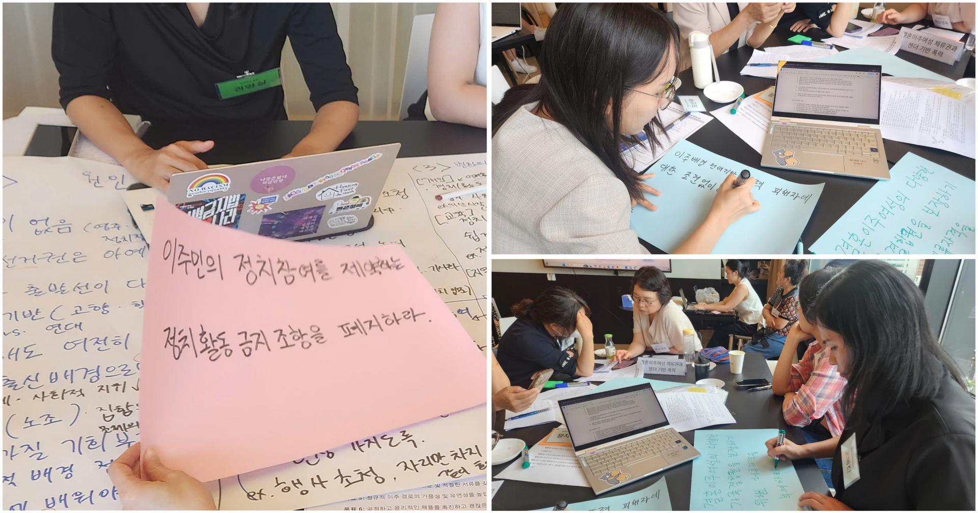 오후 세션에서는 참가자들이 세 주제(체류권, 노동권, 정치 세력화)를 중심으로 그룹 토론을 진행했습니다. 다음의 세가지의 질문을 가지고 모든 참가자들이 각각의 주제와 모두 마주하는 월드카페 방식을 통한 토론을 진행하였습니다.