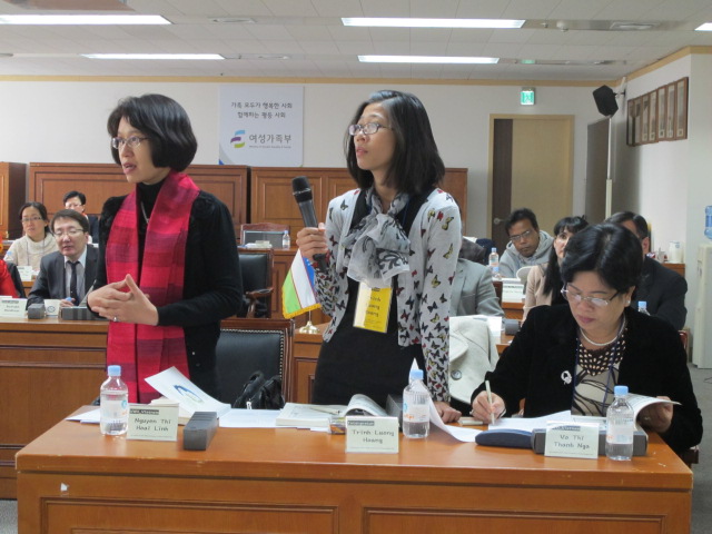 워크숍에서 질문중인 베트남 결혼이주 담당 공무원과 통역