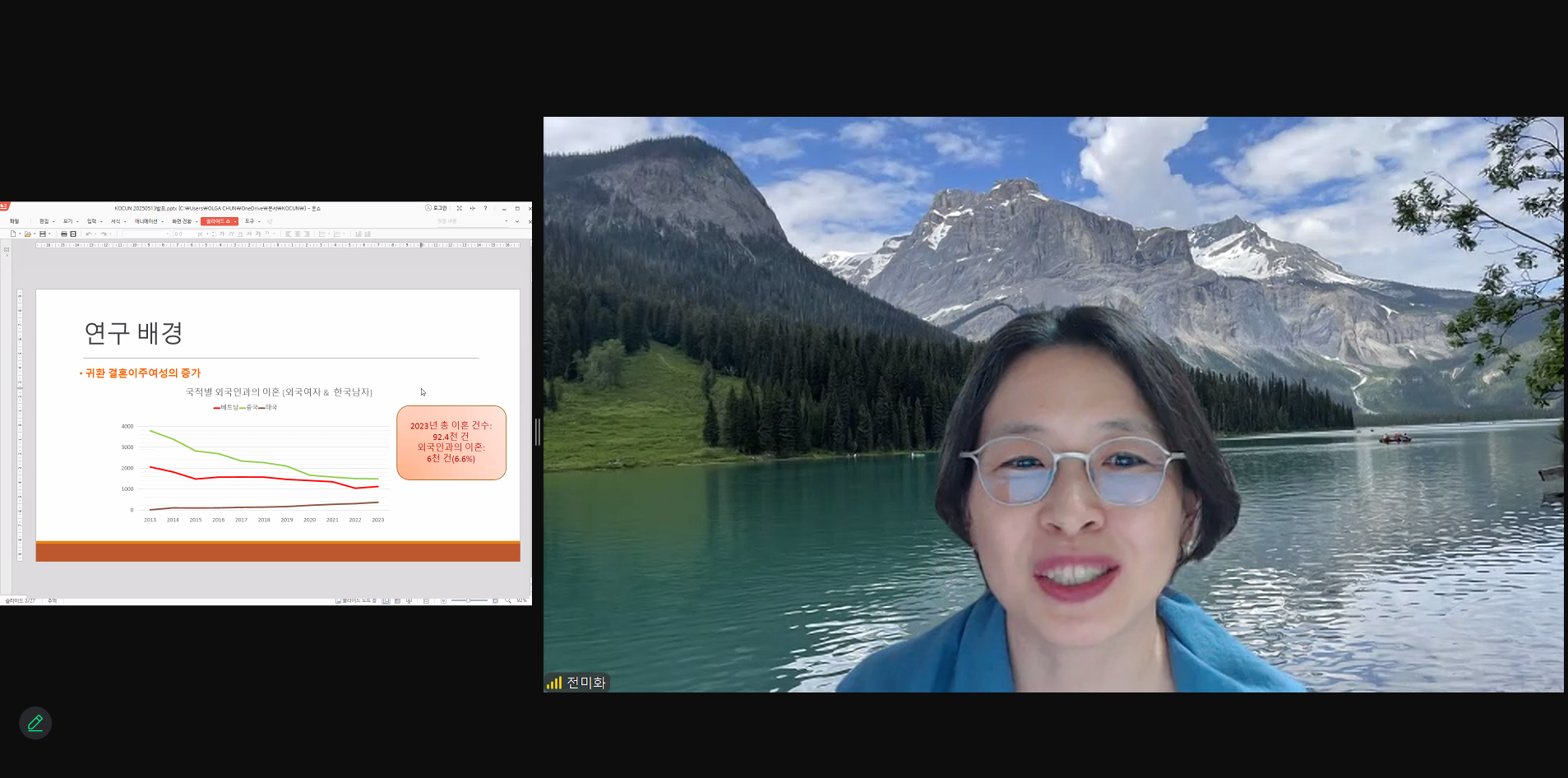 두 번째 발표에서 전미화 연구자는 [대인관계 트라우마를 경험한 베트남 결혼이주여성이 지각한 사회적 지지와 트라우마 후 성장의 관계]라는 주제로 결혼이주 여성의 ‘트라우마 이후 성장’에 주목했습니다.